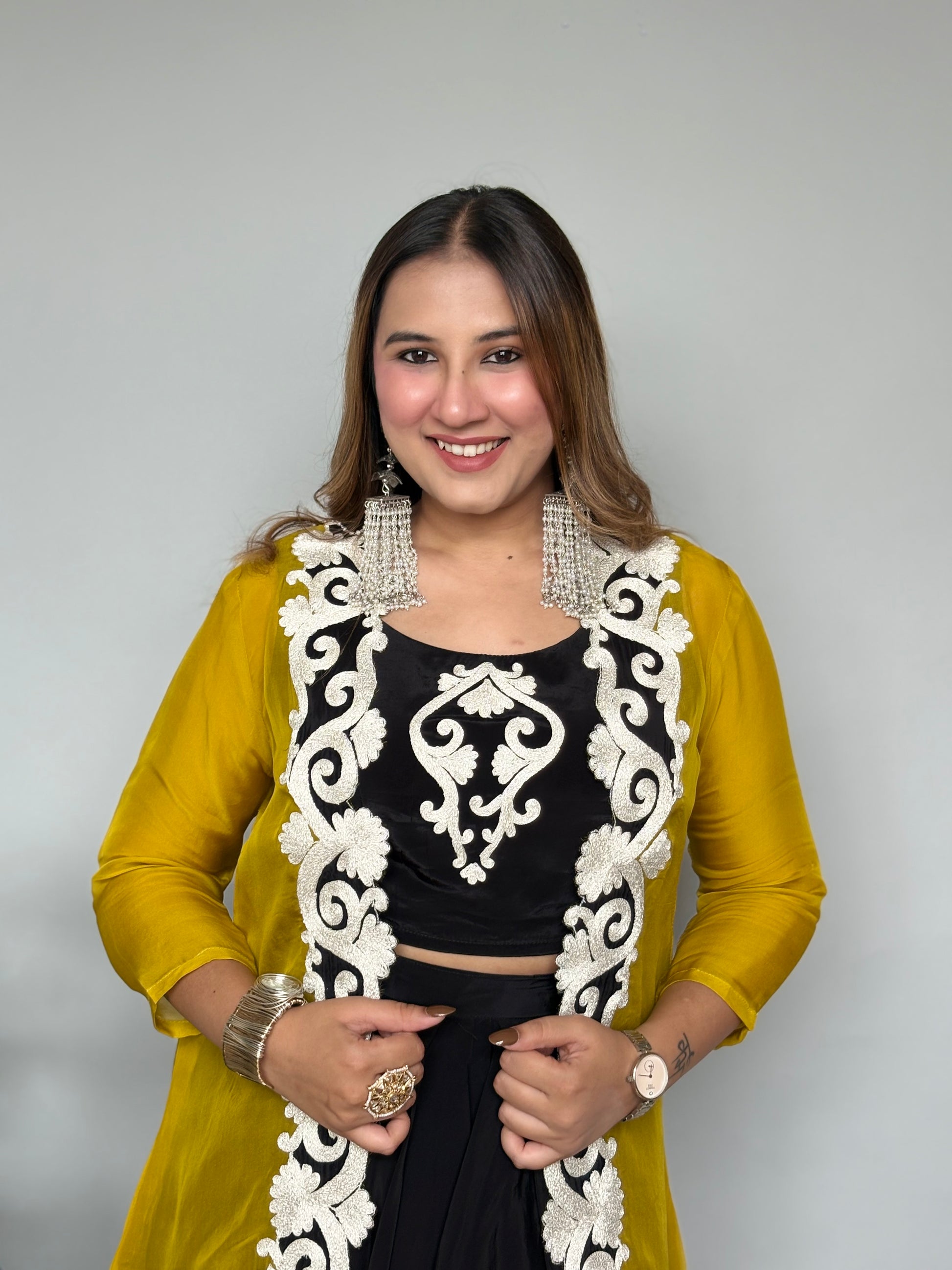 Turn heads with this chic black drape skirt set, paired with a stylish black crop top featuring intricate white embroidery. The look is elevated with a vibrant mustard yellow jacket, beautifully highlighted with bold white embroidered detailing along the front. Perfect for festive occasions, weddings, or parties, this outfit blends modern draping with a traditional touch. Style it with statement earrings and heels for a flawless, elegant look.