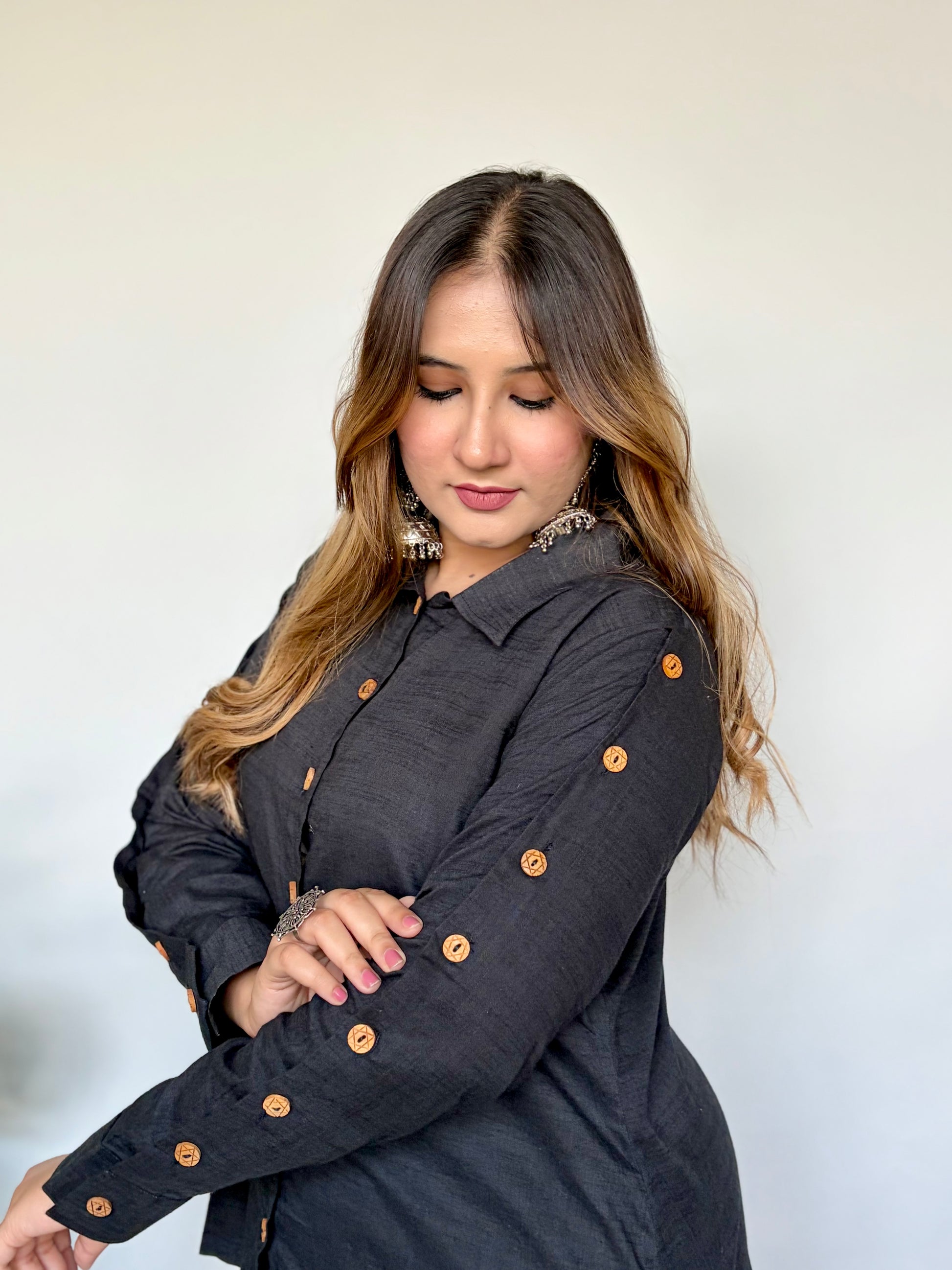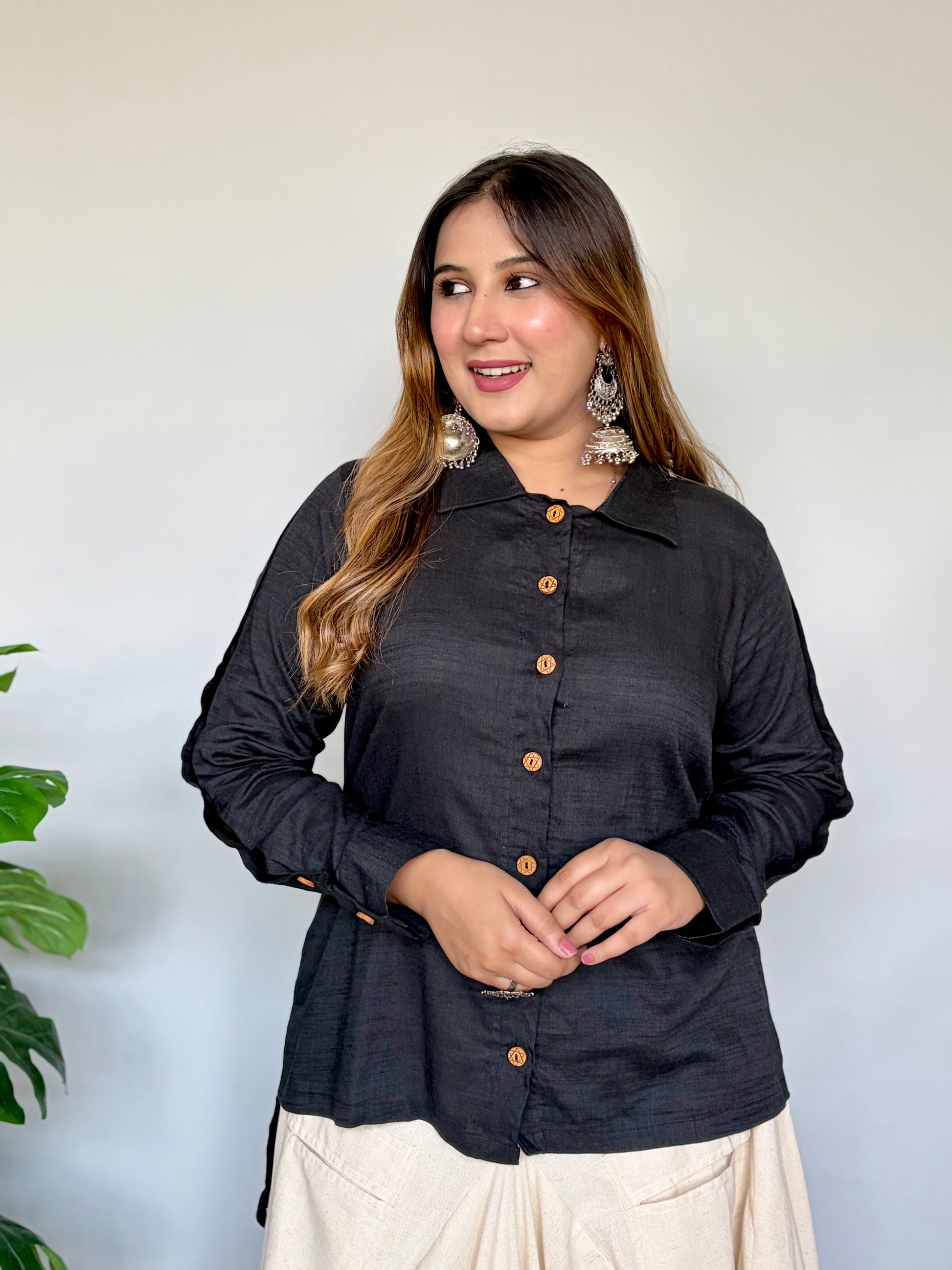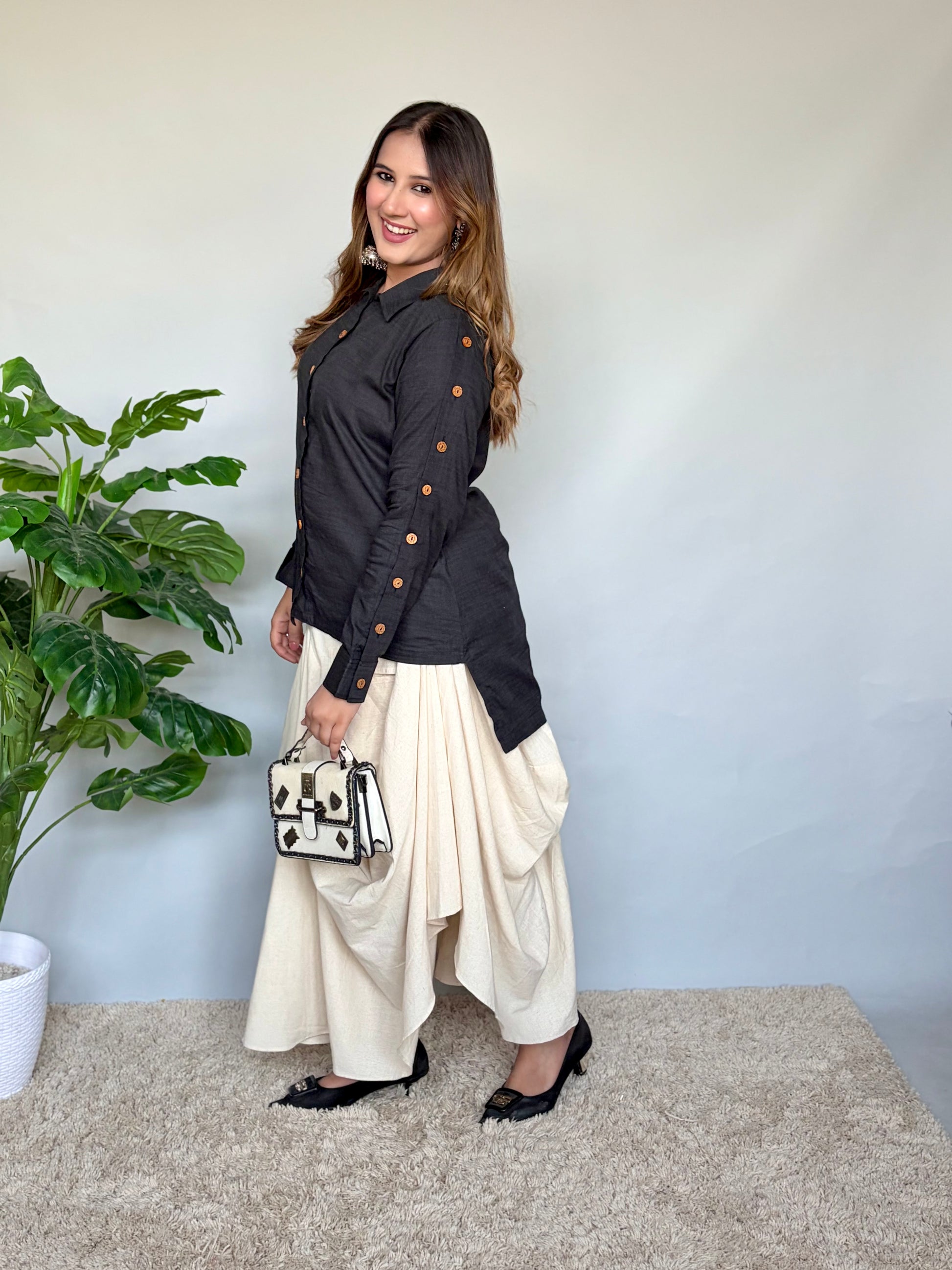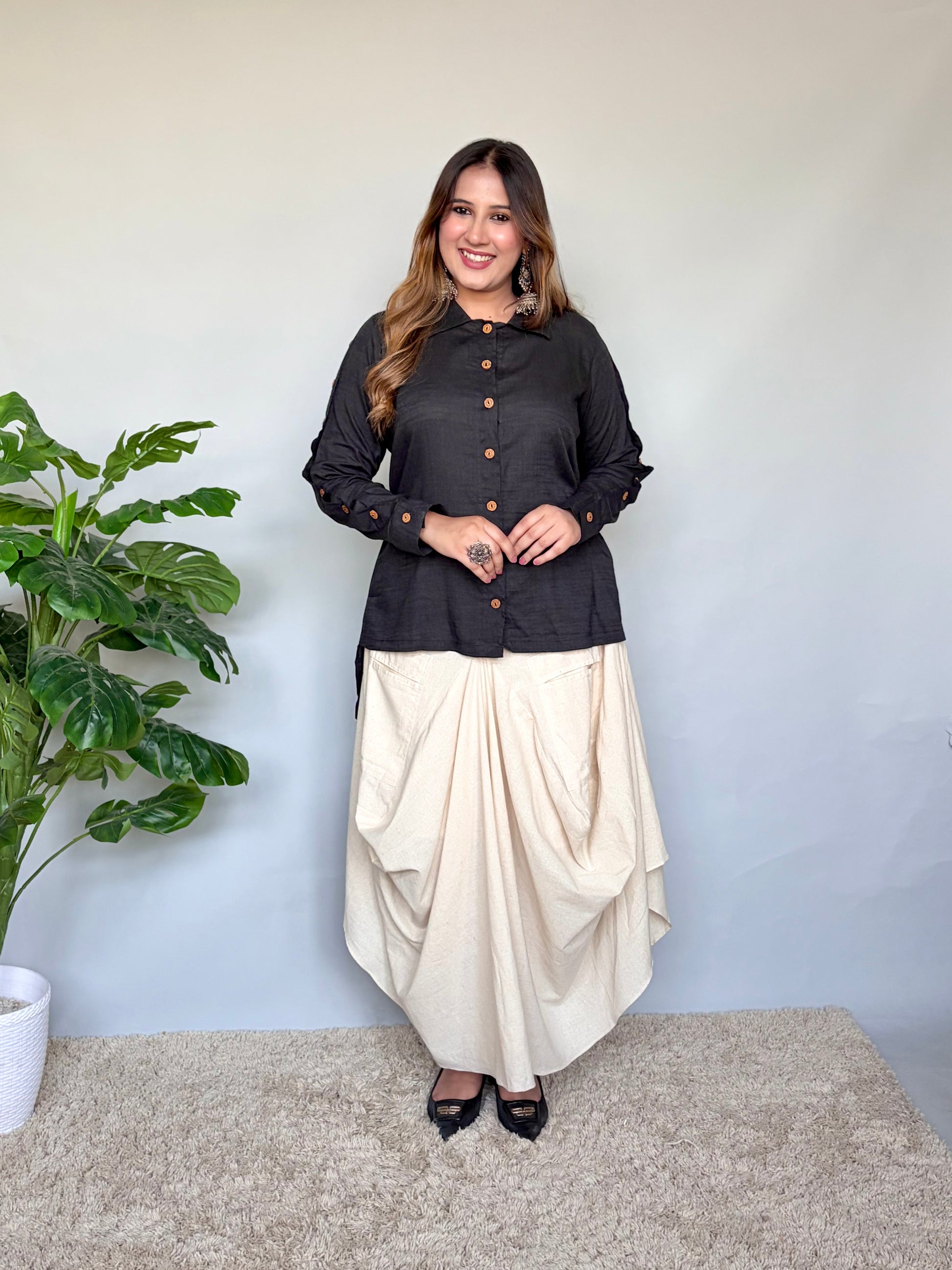Step into effortless style with this chic white button-down shirt paired with a flowy white cowl skirt. The shirt features a structured silhouette with wooden buttons and stylish slit-tie detailing on the sleeves, giving it a modern, polished look. Paired with a soft, draped white cowl skirt, the outfit offers both comfort and flair, making it perfect for casual outings, festive gatherings, or everyday elegance.