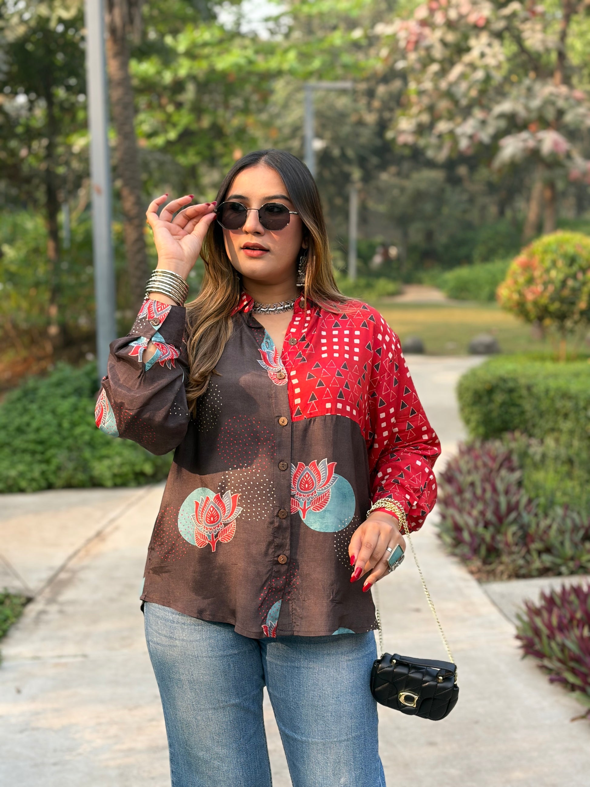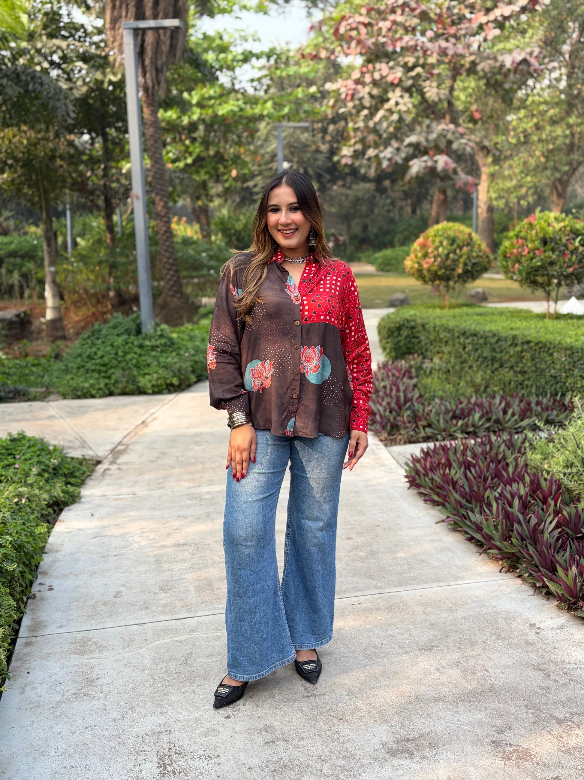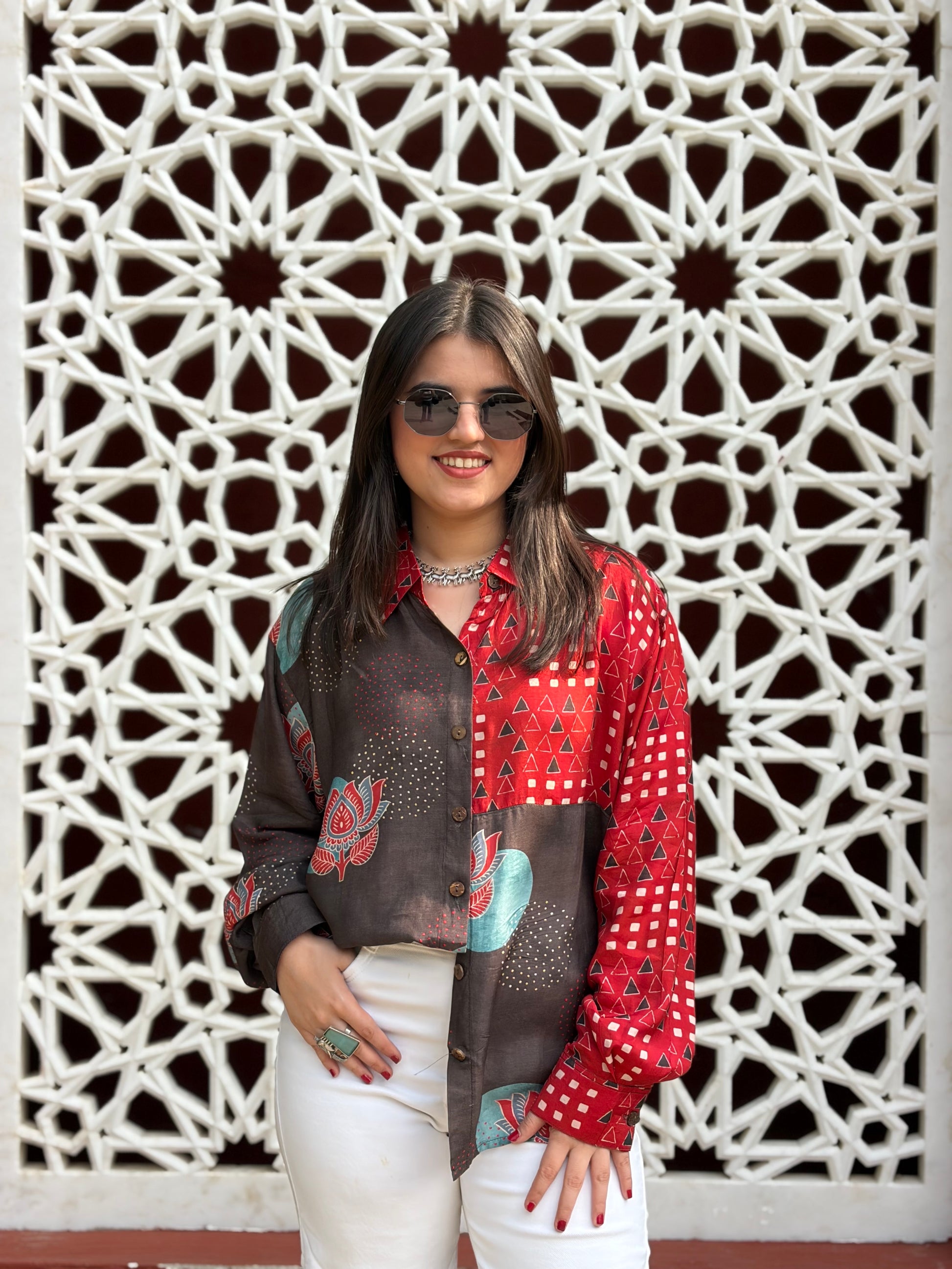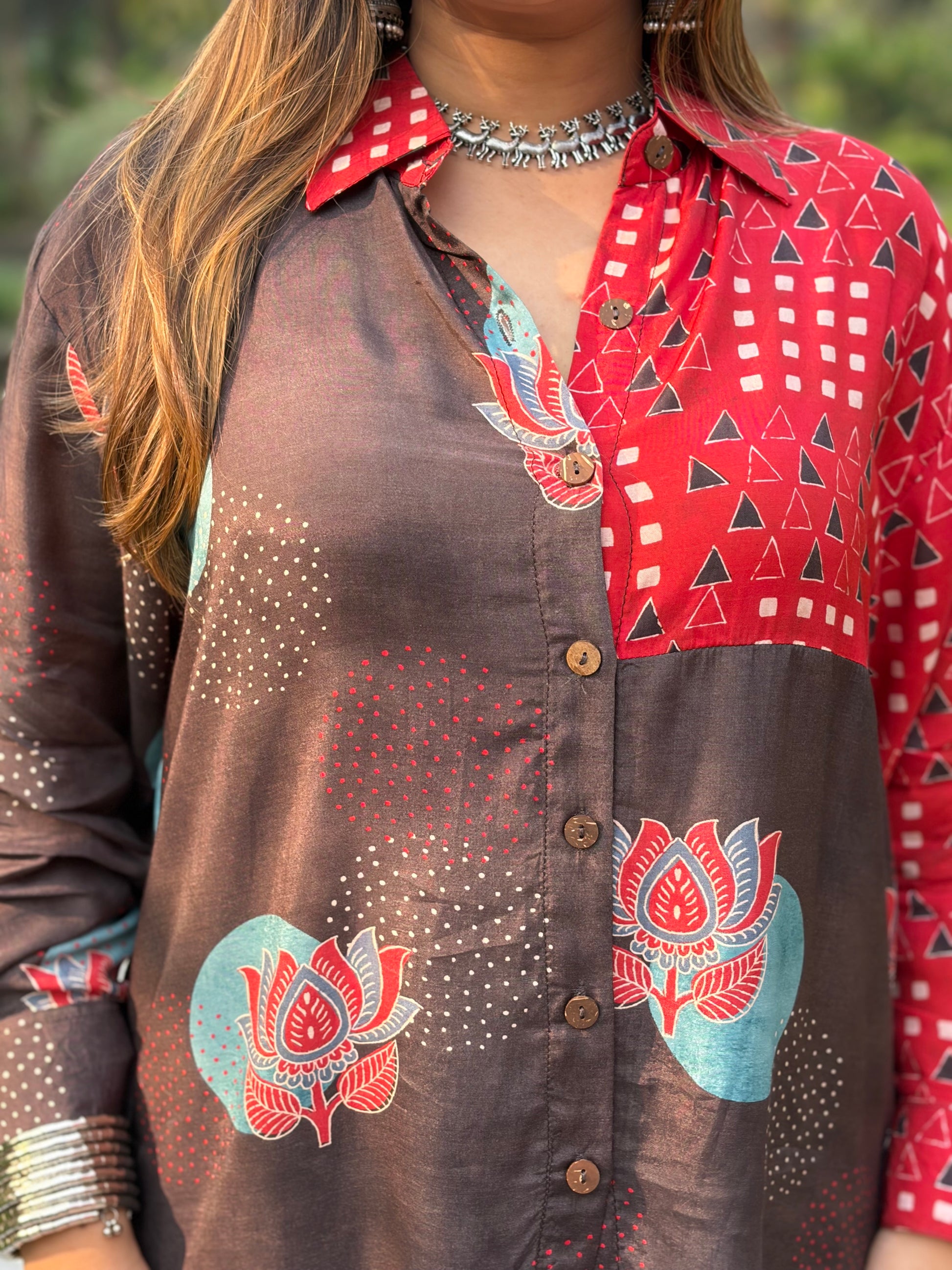 Red and Brown Printed Oversized Shirt